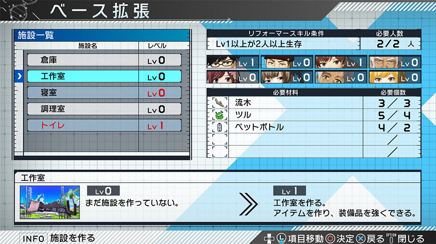 サバイバル能力を向上させるためには、廃墟探索で資材を確保し、ベース拡張を行う事で、新たな施設を利用できるようになる。