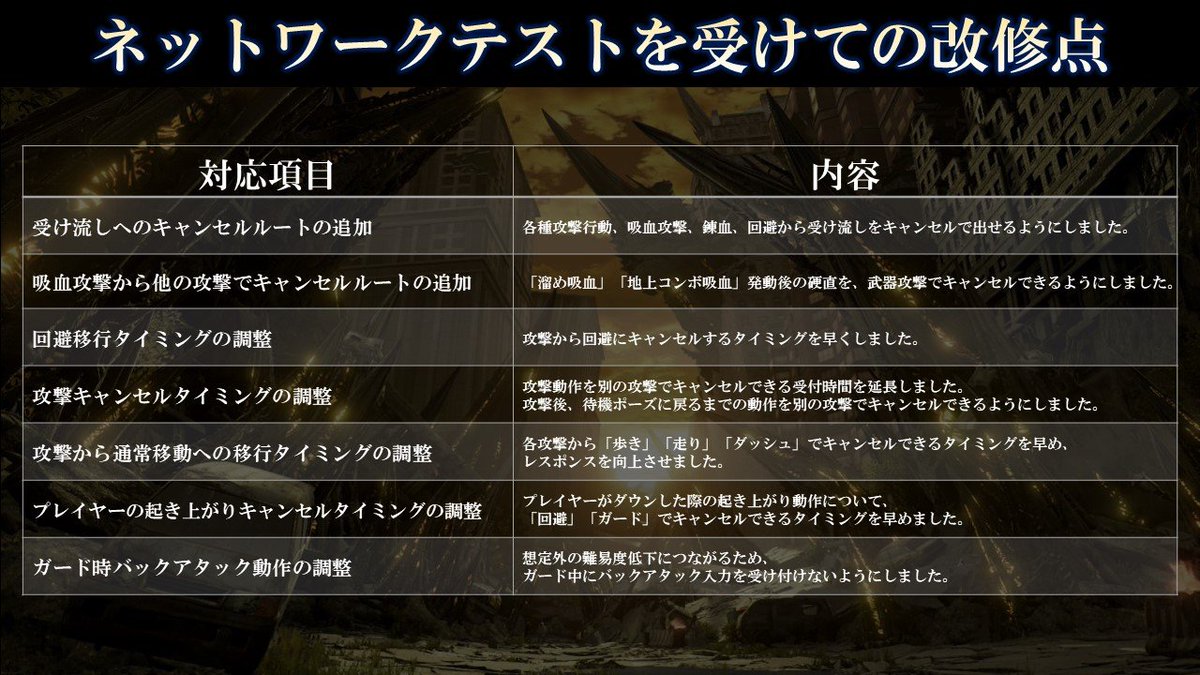 また体験版配信の発表に合わせて、前回実施したネットワークテストを受けてのアクション改修点リストも公開されていす。