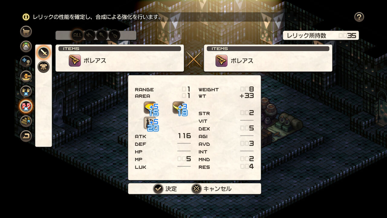同名のレリックは、ショップにて掛け合わせて攻撃種、エレメント、種族に対する耐性パラメーターを強化することができます。強化を重ね 、より強い敵への戦いに挑みましょう。