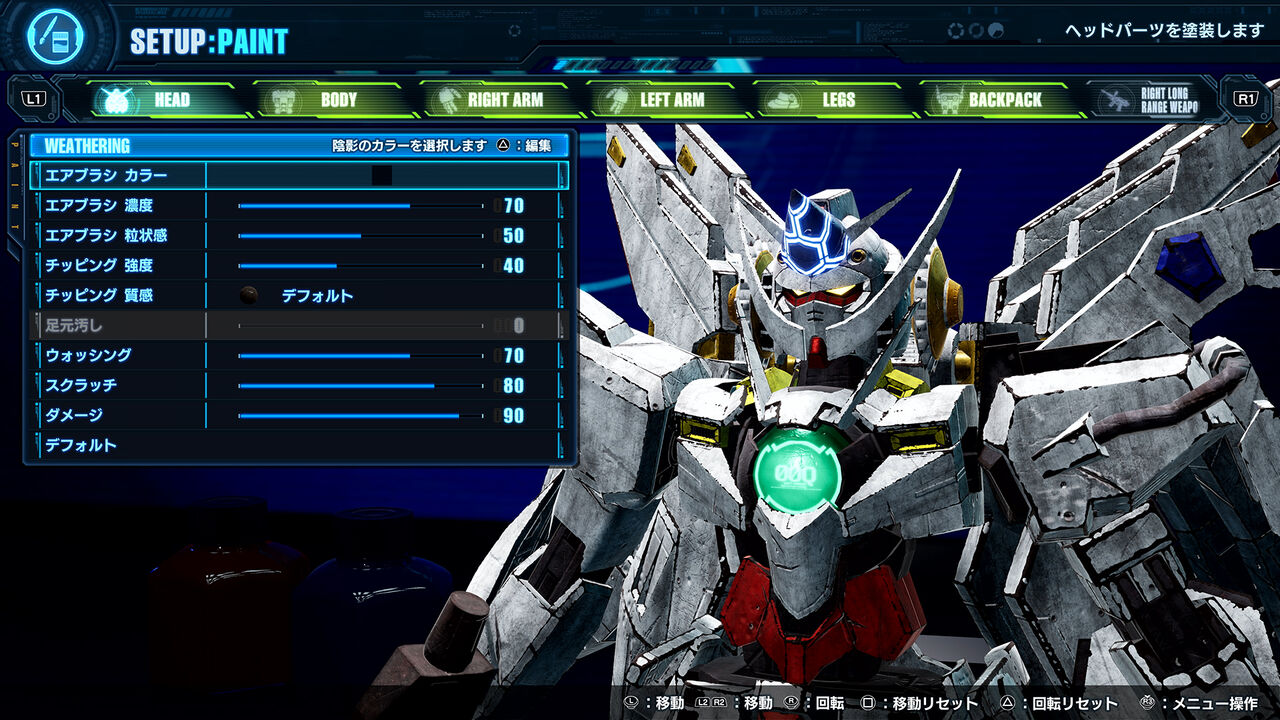 頭、胴体、右腕、左腕、脚、バックパックなど、11種類のパーツを組み合わせて俺ガンプラを創り戦いに備えましょう! 俺ガンプラはパーツを組み合わせるだけではなく、部位毎のペイントや、汚しや傷表現などのウェザリング加工も可能です。