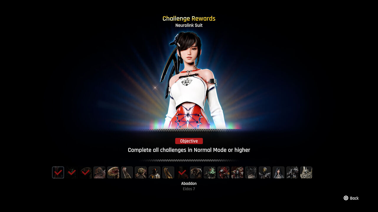 すべてのボスをノーマル以上の難易度で倒せば、報酬として”ニューロリンクスーツ”(イヴ用)を手に入れることができます。今こそあなたの強さを証明するときです!