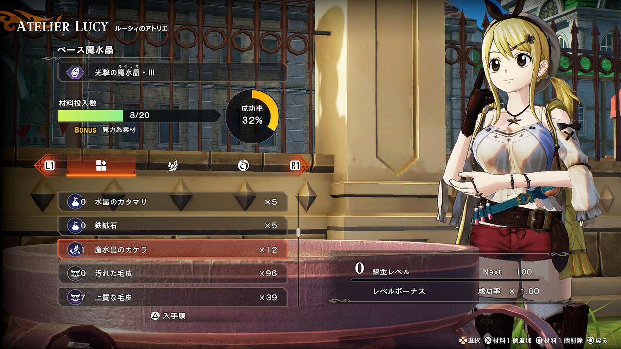 ギルドの庭に突如現れた錬金釜で、フィオーレ王国中で集めた素材やラクリマを使って「ルーシィ」がより強力なラクリマを調合する、「アトリエ」シリーズファン必見の内容です。
