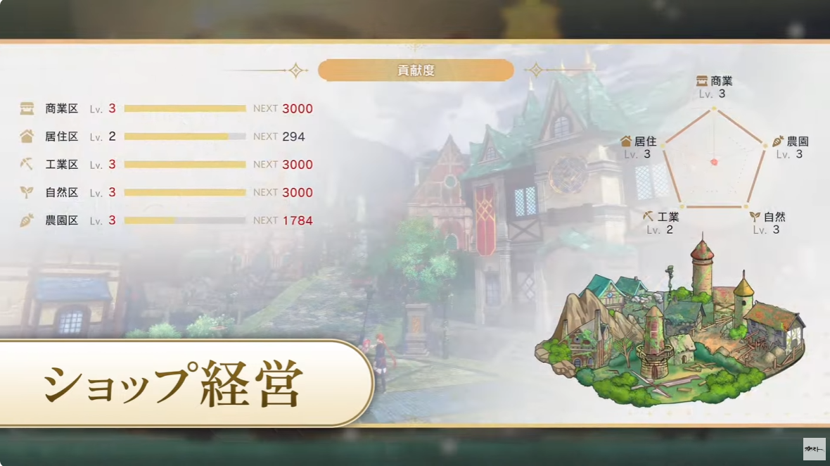 さまざまなアイテムを販売して町の復興を盛り上げ、ショップ経営で得た資金や資源を投資すれば町が発展する。町に活気が戻ることで、新たな調合レシピを収めた参考書が流通し、物語はさらなる展開を迎える