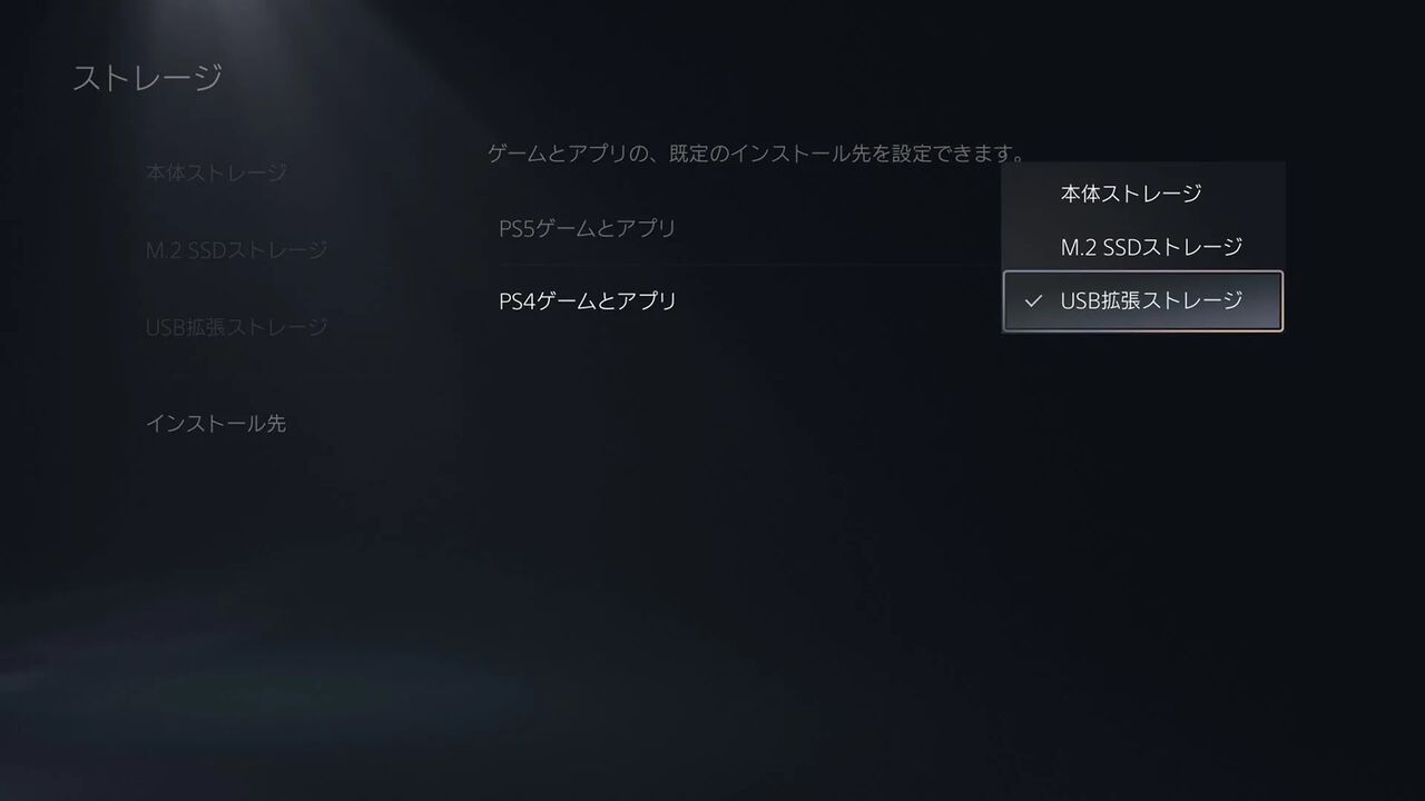 取り付け後は、外付けUSBドライブにゲームデータを直接インストールするよう設定を変更できます。ただし、設定できるのはPS4ゲームのみです。設定方法は、ホーム画面から[設定]>[ストレージ]>[インストール先]へと進み、[PS4ゲームとアプリ]で[USB拡張ストレージ]を選択します。