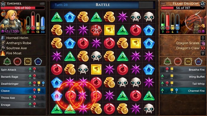 同じ色のジェムを3つ以上そろえてマナを獲得し、スペルを使って敵と戦い、