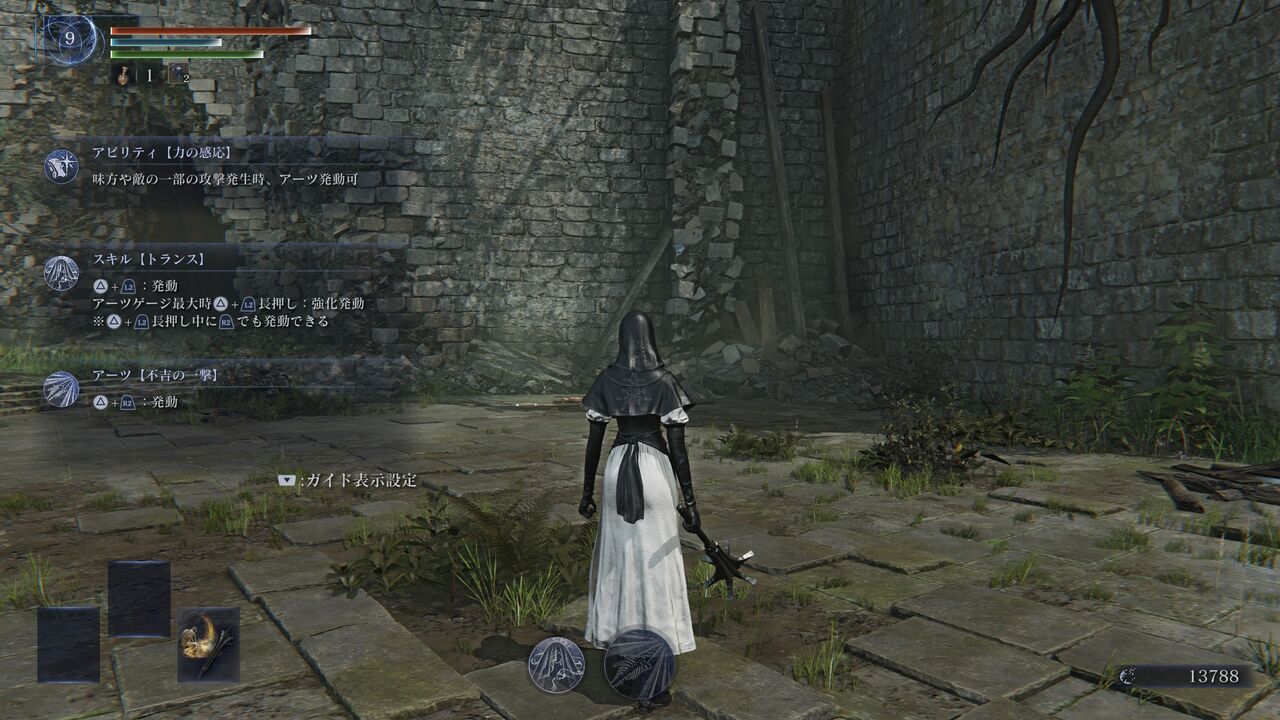 - 表示切替の操作で、装備中の遺物の効果を確認できます。