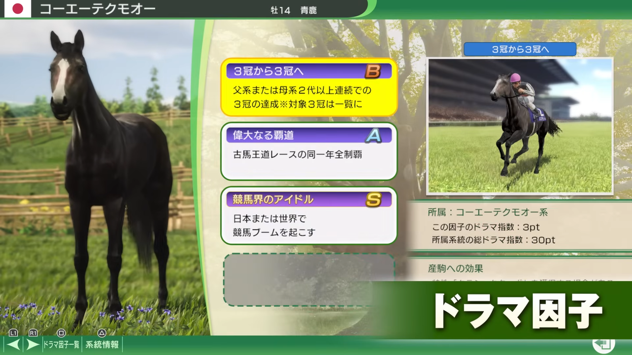 系統確立における最大の栄誉として、「始祖系統」を追加。血統繁栄はもちろんのこと、血を引く馬たちのドラマチックな活躍が重要になるため、より歯ごたえのある配合・生産を楽しめます。さらに、名馬生産のカギとなる新要素「活力」と「ドラマ因子」を追加。奥深く進化した配合・生産システムによって、「始祖系統昇格」という究極の目標を目指します。