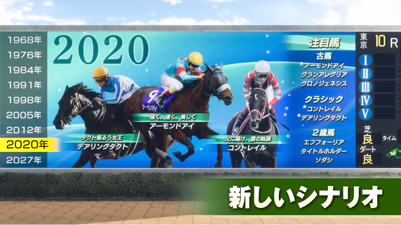 「ウイポ」史上最古の1968年開始シナリオが登場するほか、3冠馬対決が記憶に新しい2020年シナリオも追加。また、最新の活躍馬の登場はもちろん、新専用実況の追加や新たな女性秘書の追加など、馬主ライフをより楽しめる要素が満載です。