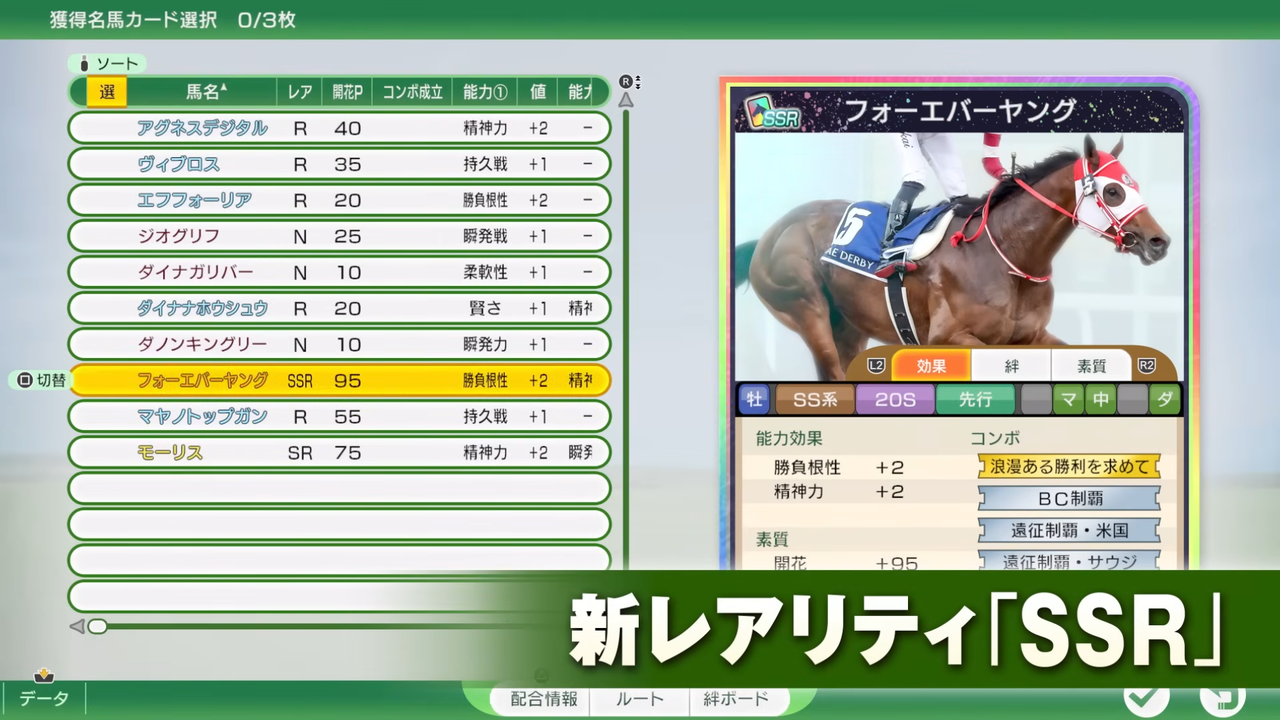 「最強馬ロード・オンライン」モードに、新レアリティ「SSR」の名馬カードが登場。SSRには競馬史に輝く超強力な名馬が登場。特大の「開花ポイント」を持つため、より強力な愛馬を育成できます。また、同じ名馬カードを重ねることで、大きく能力強化できる「限界突破」が可能に。配合に使用することで、さらに強力な愛馬を生産できます。