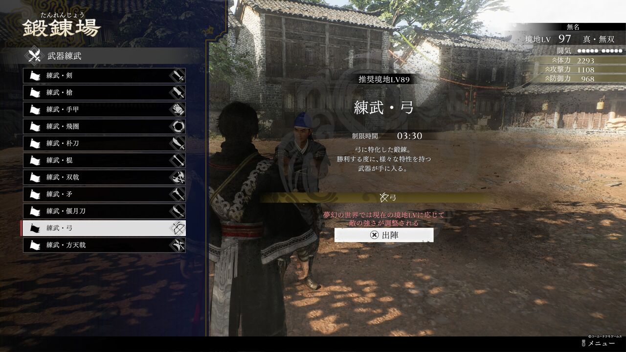 ・DLCで新たに加わった「鍛錬場」では武闘大会の他に武器練武というタイムアタックがあります。