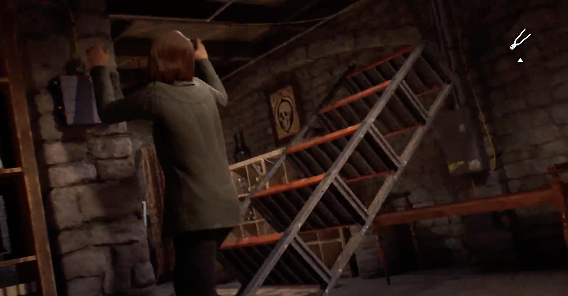 その行動で明らかになった事実により、マックスは不穏なアブラクサス邸を調査するようになり、Rewind をよりアクション重視で使うようになりました。ジャーナリズムを学ぶ学生のロレッタというお馴染みの人物とばったり出会った後、二人の女性は不気味な地下室に閉じ込められ、発見される危険にさらされていました。ほうきでドアを塞ごうとしたのですが、無駄でした。Rewind のおかげで、はるかに頑丈な金属製のバールを見つけることができました。