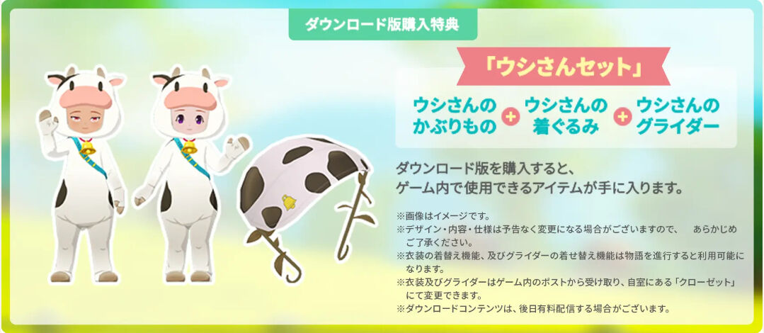 『牧場物語 Let's!風のグランドバザール』ダウンロード版を購入すると、購入特典として、主人公の衣装とグライダーがセットになった、「ウシさんセット」が入手できます。