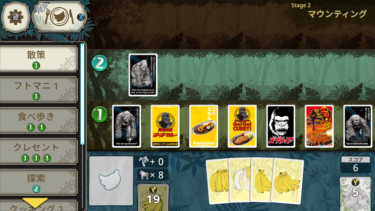 ゲームに勝利するには7匹以上のゴリラが地面に並んでなければならないが、バナナをもらえないゴリラがいたら敗北、群れの崩壊である。