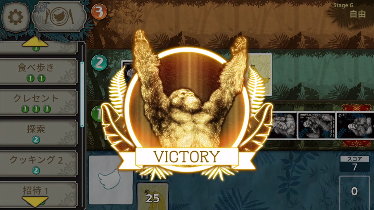 無事場の最下段に7体のゴリラを並べてバナナを補給しターン終了できれば勝利